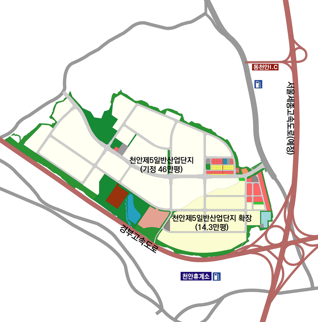 기존 천안제5일반산단 46만여평에 금번 14만여평의 확장사업으로 전체 60여만평의 산업단지가 완성되며, 산업시설 뿐만아니라 물류·주거·지원 공공시설 등 업무효율성과 편의성을 제공합니다.